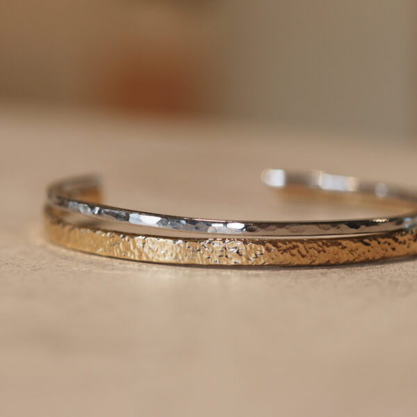 厚みが薄く、平たいバングルです。3.5mmのプラチナ・K18ゴールドの素材を用いるため、豪華で堂々とした風格のデザインとなります。