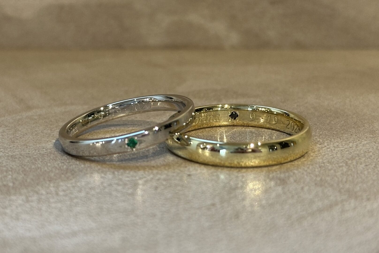 A "new birthstone" or "anniversary diamond" can be added next to the engraving to mark a 10th or 20th wedding anniversary, or when a new family member is born or welcomed into the family. The story of the engraving is added along with the couple's history. We have been swinging the hammer at this Sangenjaya location since 1970, in order to always be ready to accept the "continuation" of the story.