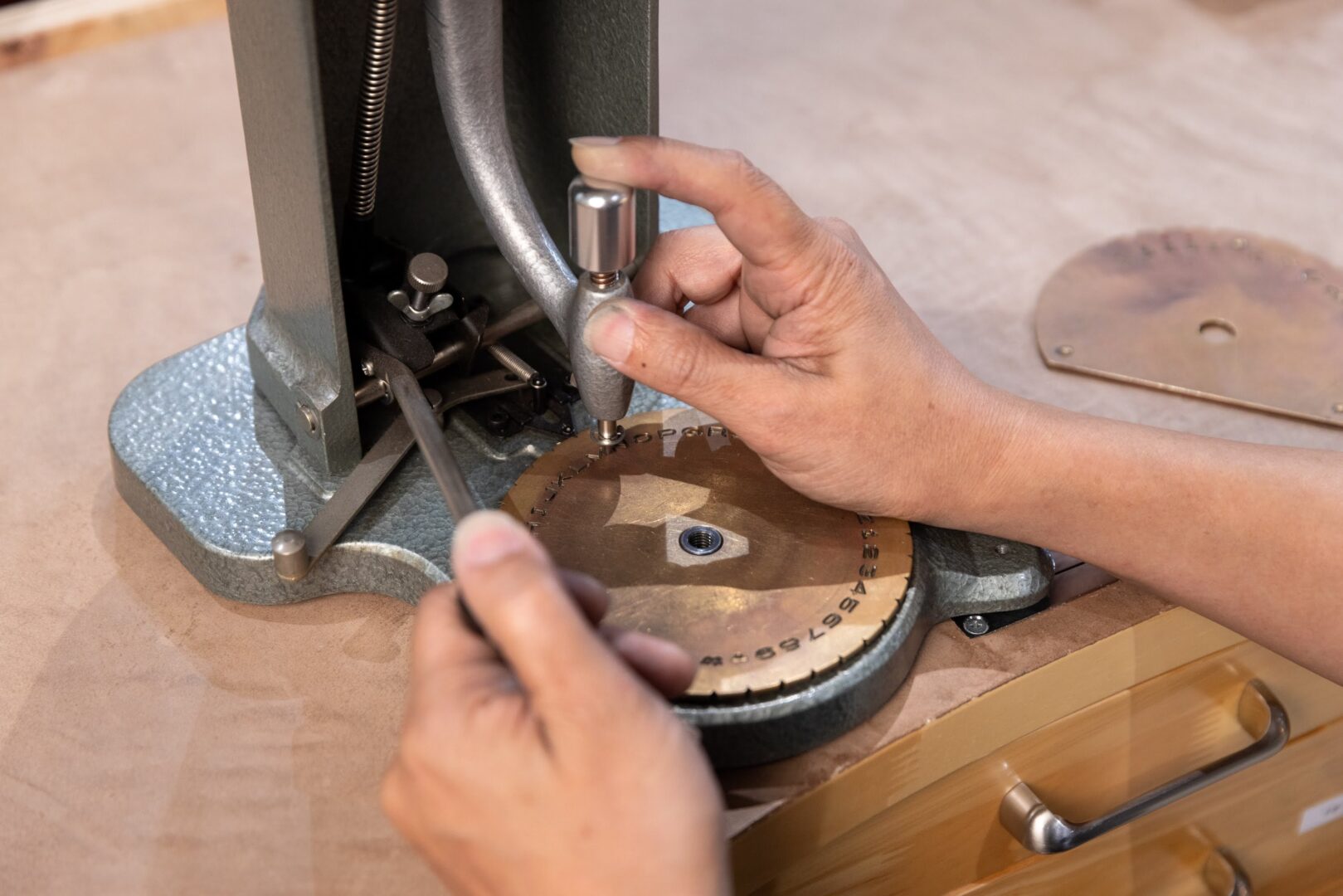 - Craftsmanship engraving with a dial engraving machine: A craftsman operates the dial and engraves the metal surface with a needle that has a diamond at its tip. The grooves of the letters are deeply engraved in a V-shape, which reflects the light and makes them sparkle.