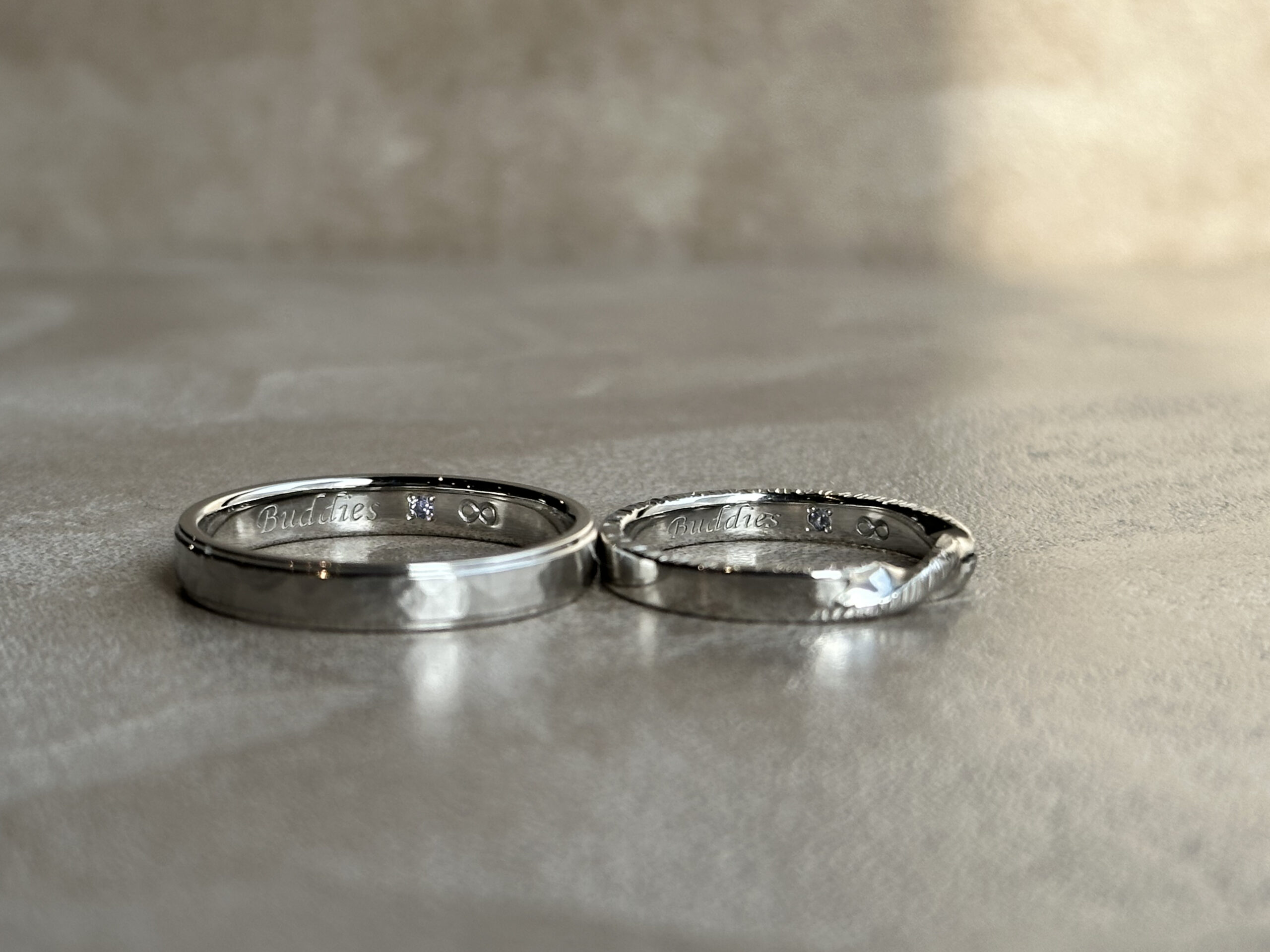 We recommend the style in which two rings are placed side by side to complete a single sentence. Even when you are apart, the "continued words" engraved on the other person's ring will remind you of the invisible bond between you.