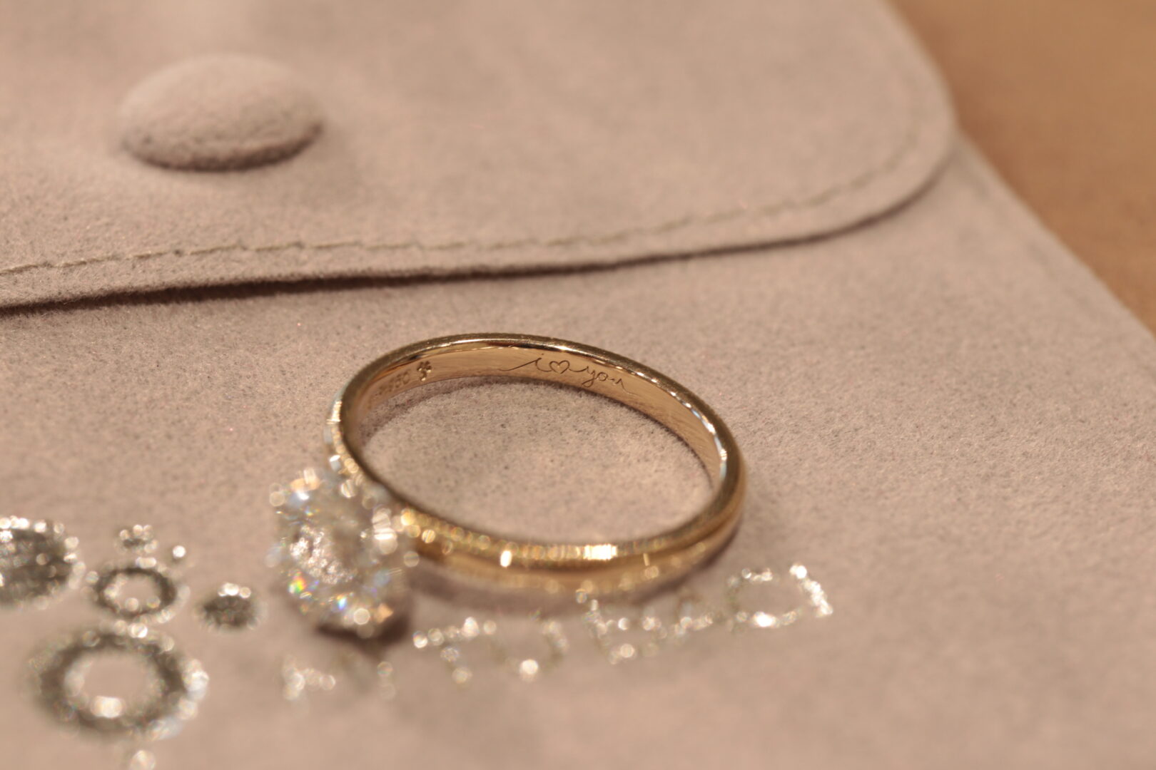 The other day, a couple visited our workshop in Sangenjaya to have their ring resized. The ring had been handmade by the couple at our workshop 12 years earlier. When our craftsmen carefully polished the ring and returned it to the couple, they looked lovingly at the engraving on the inside and smiled, saying, "It filled my heart with joy to remember the words we had decided after much deliberation at that time. The engraving is like a "time capsule" that instantly evokes memories of that time.
