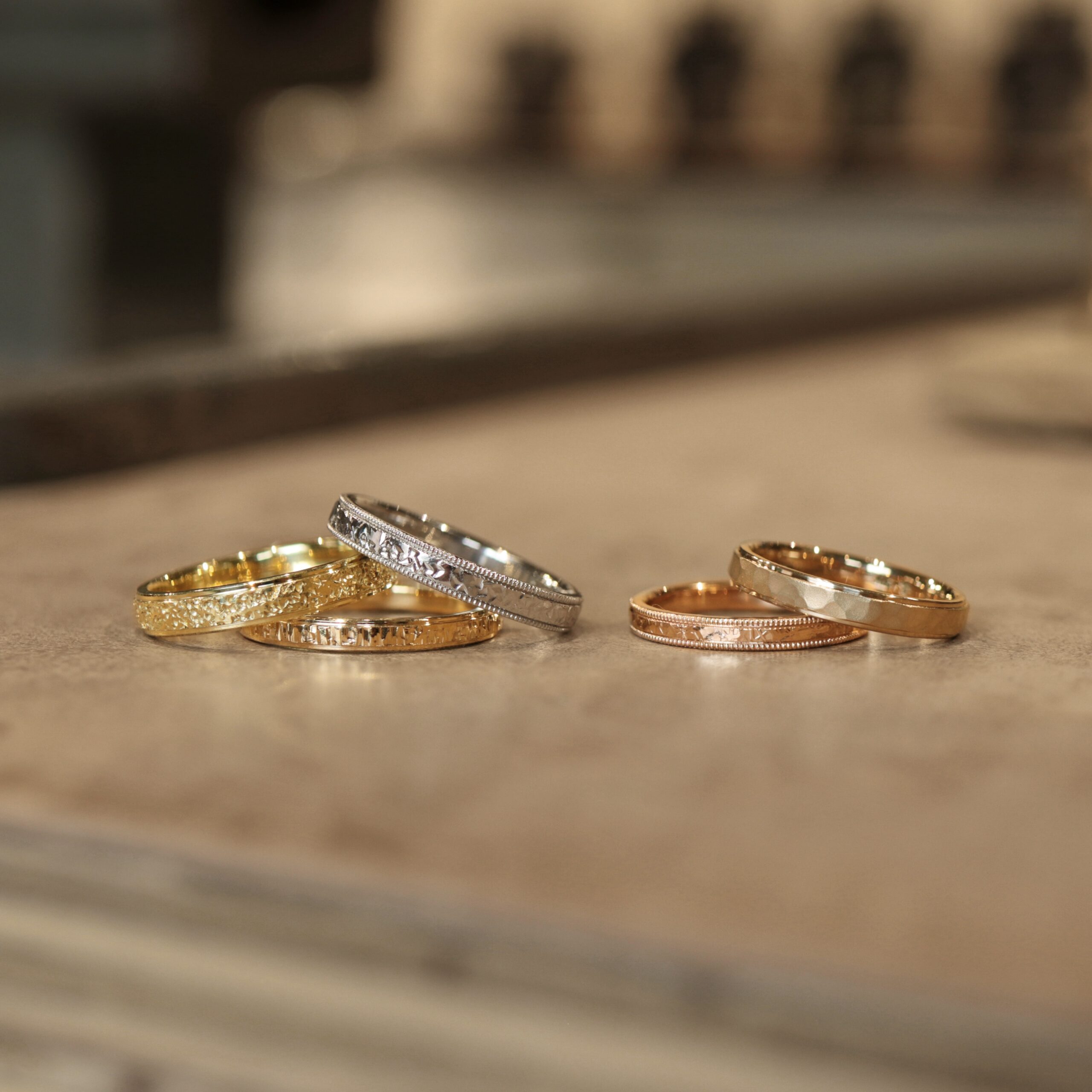 개성을 살릴 수 있는 다양한 표면 처리을 준비했습니다. 가장 인기 있는 것은 망치를 이용해 반지 표면에 무늬를 새기는 망치 무늬입니다. 결혼반지는 보통 평범한 거울 표면이 일반적이지만, 망치 무늬 가공의 결혼반지는 보다 세련되고 공예감을 느낄 수 있는 것이 그 인기의 이유입니다.