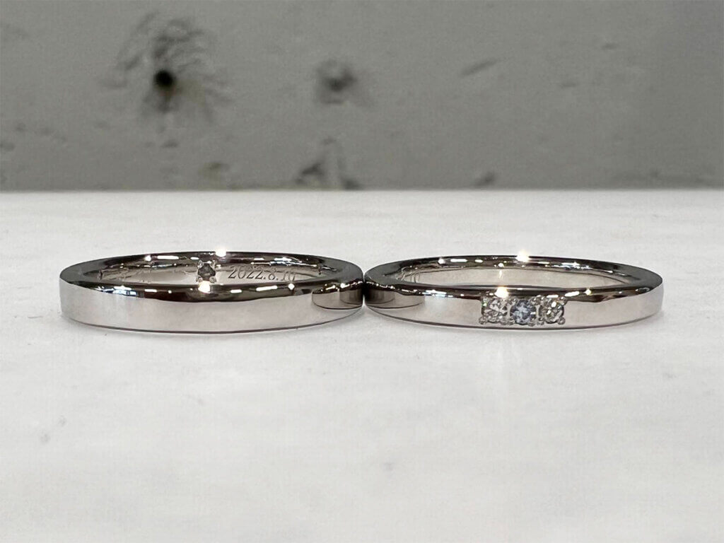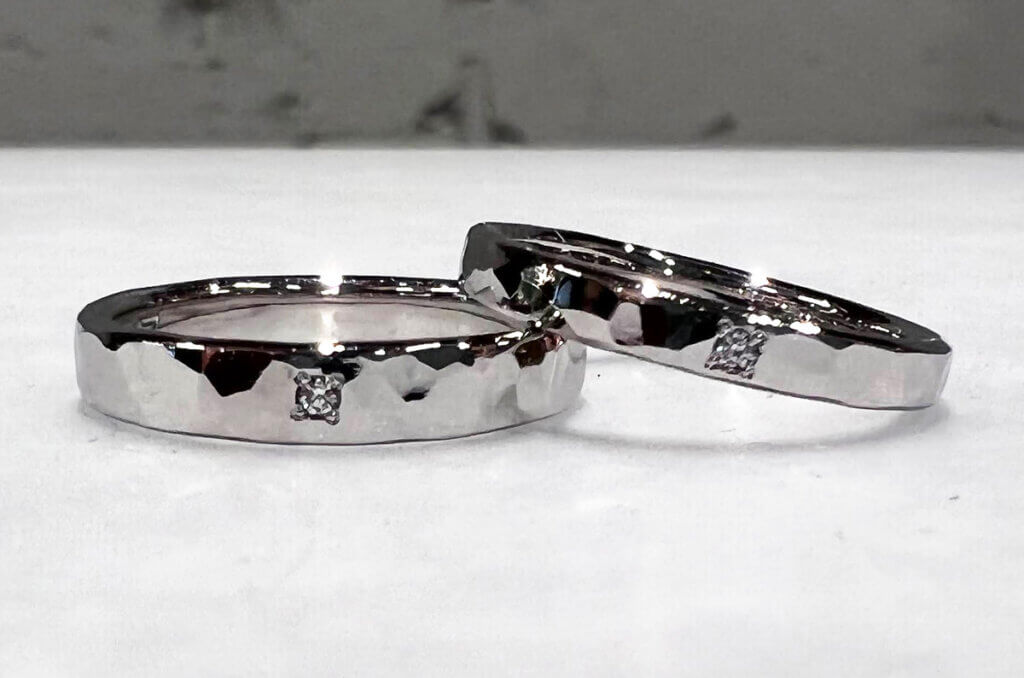 Pt950 플래티넘(3.5mm) + 다이아몬드 Pt950 플래티넘(2.5mm) + 다이아몬드 업무 관계로 나가노와 도쿄를 오가는 K씨 부부가 기념 반지를 만들기 위해 방문해주셨습니다. 두 분이 협력하여 제작해 주셨습니다. 두 분 모두 같은 망치...