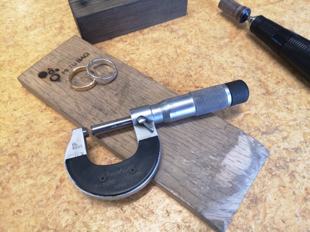 100分の1ミリまでこだわる・マイクロメーター こんにちは職人の新藤です。今日は普段工具を使わない方には、かなり理解に苦しむ話になるかも知れませんが是非あきらめずに最後まで読んでください。 マイクロメーターとは? MITUBACIコレクションのリング制作では均…