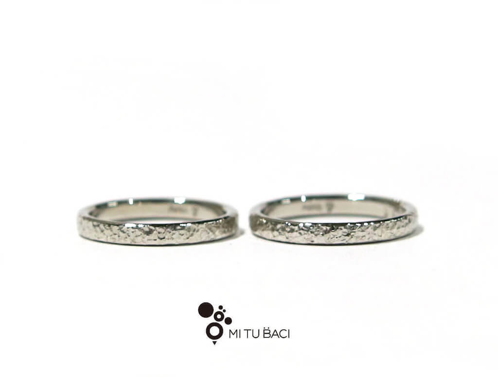 きらきらの槌目テクスチャーで手作り結婚指輪を作られたS様をご紹介します。 <指輪詳細> ・Ptプラチナ950(3.0mm幅)槌目 ・K18イエローゴールド(3.0mm幅)槌目 アンケートにご協力いただきましたので、ご紹介いたします。 *** ◇手作りブライダル…