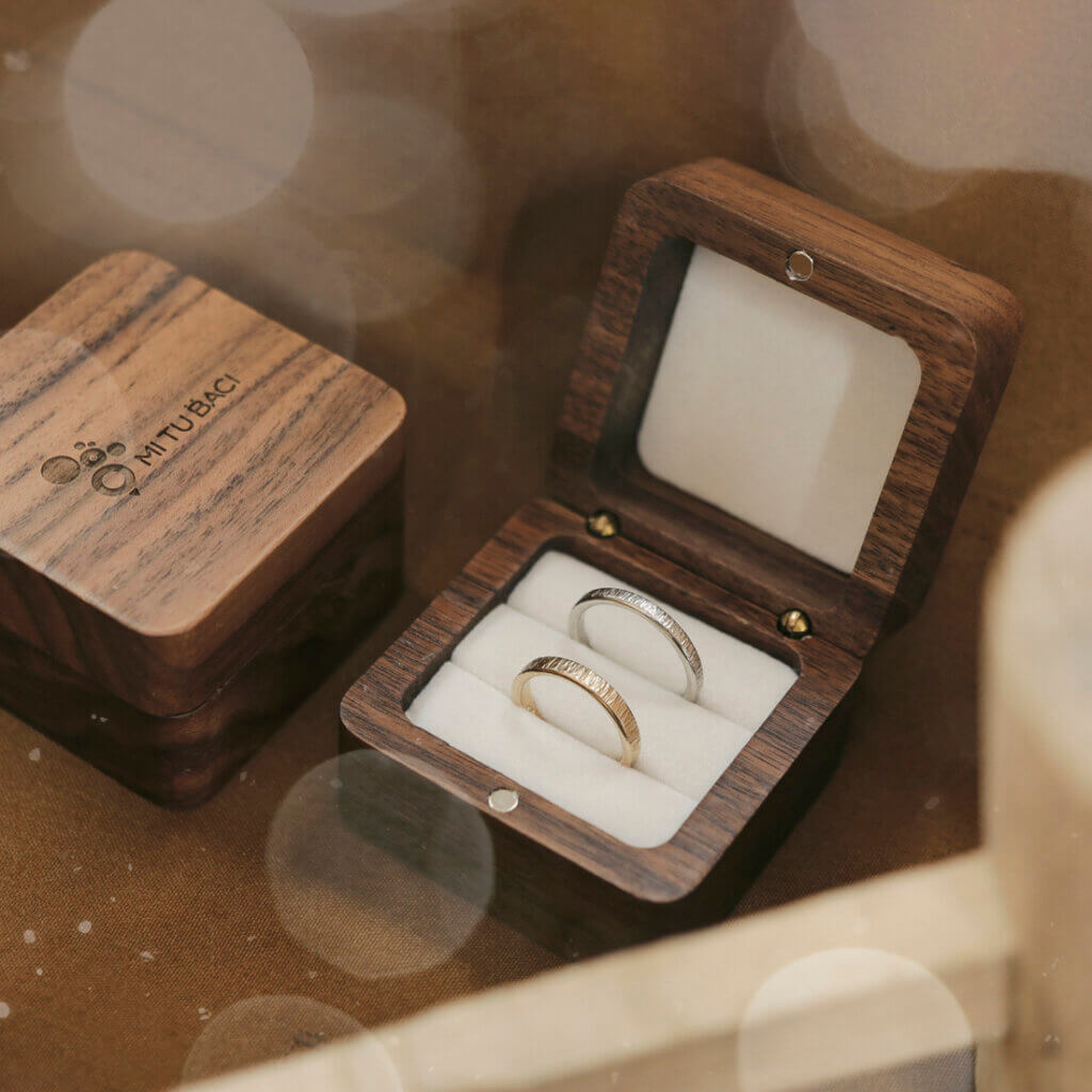 MITUBACIの手作り結婚指輪は、指輪の表側だけでなく、指輪の側面にもテクスチャを入れることができます。指輪の側面にも模様を入れることにより、角度によって異なる表情を見せる、個性的なデザインのジュエリーに仕上がります。 表面が模様のないプレーンな指輪でも、サ…