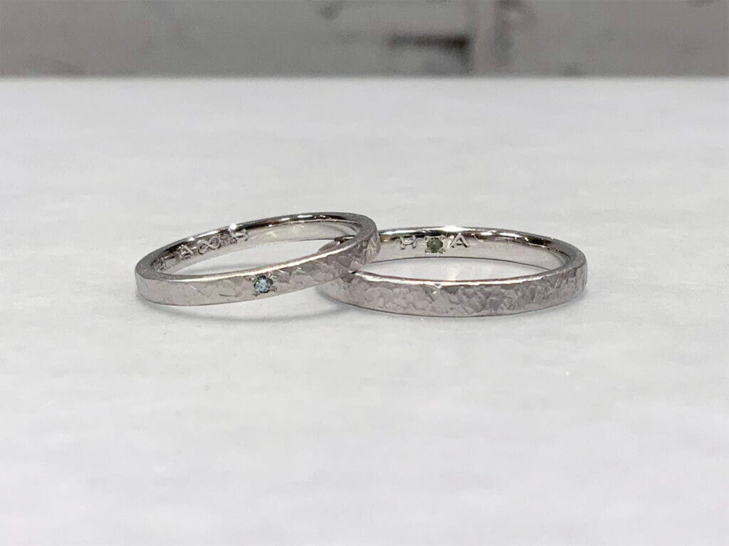 <指輪詳細> Pt950プラチナ(2.0mm)フロスト+ブラスト(つや消し)+アイスブルーダイヤモンド Pt950プラチナ(2.5mm)フロスト+ブラスト(つや消し)+ペリドット プラチナの手作り結婚指輪を作ってくださったH様ご夫妻をご紹介します。 1ヵ月ほど…